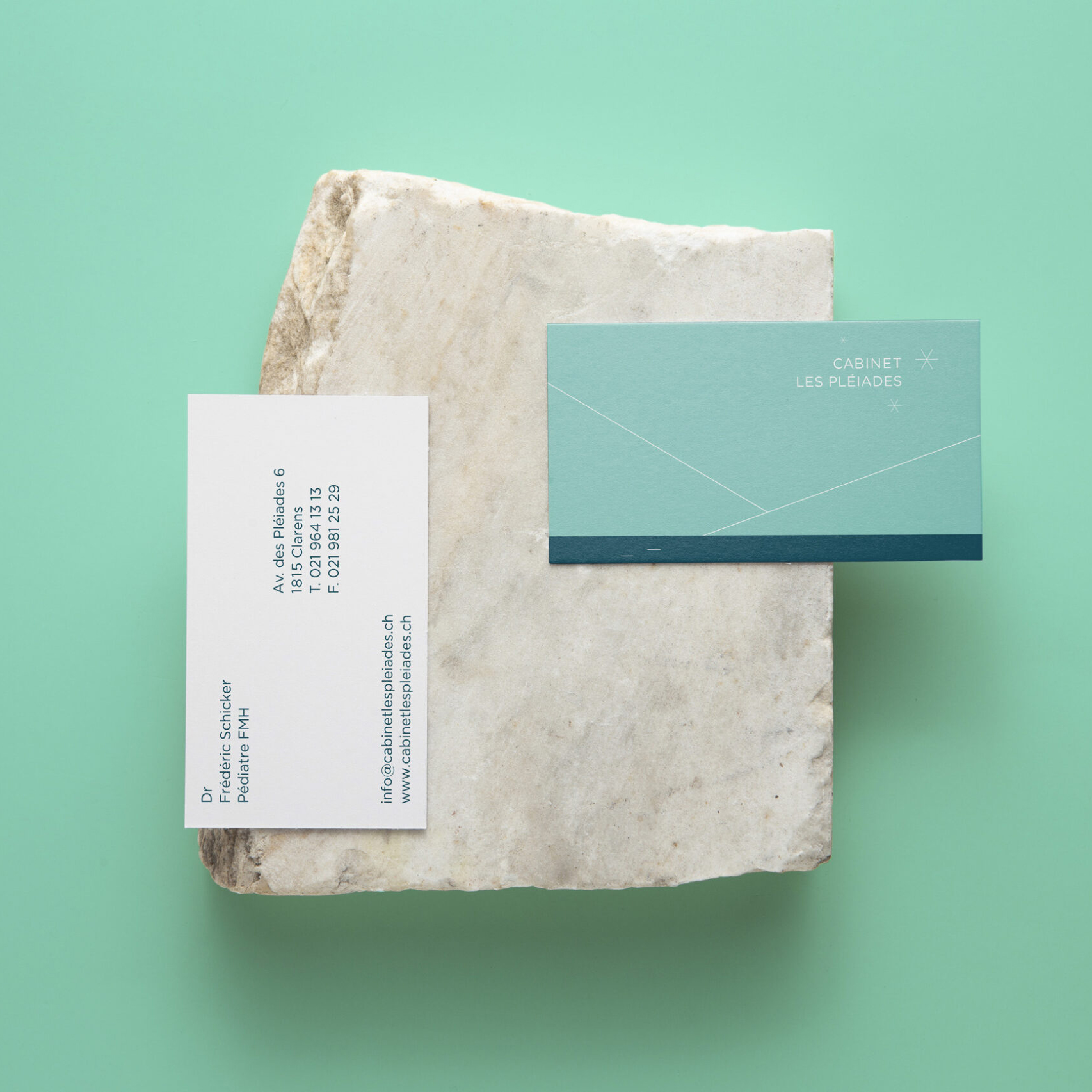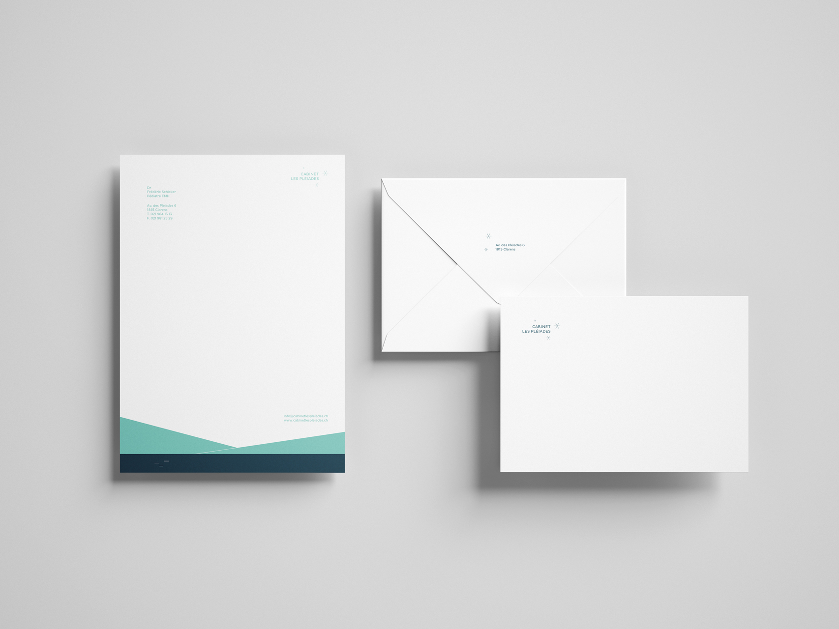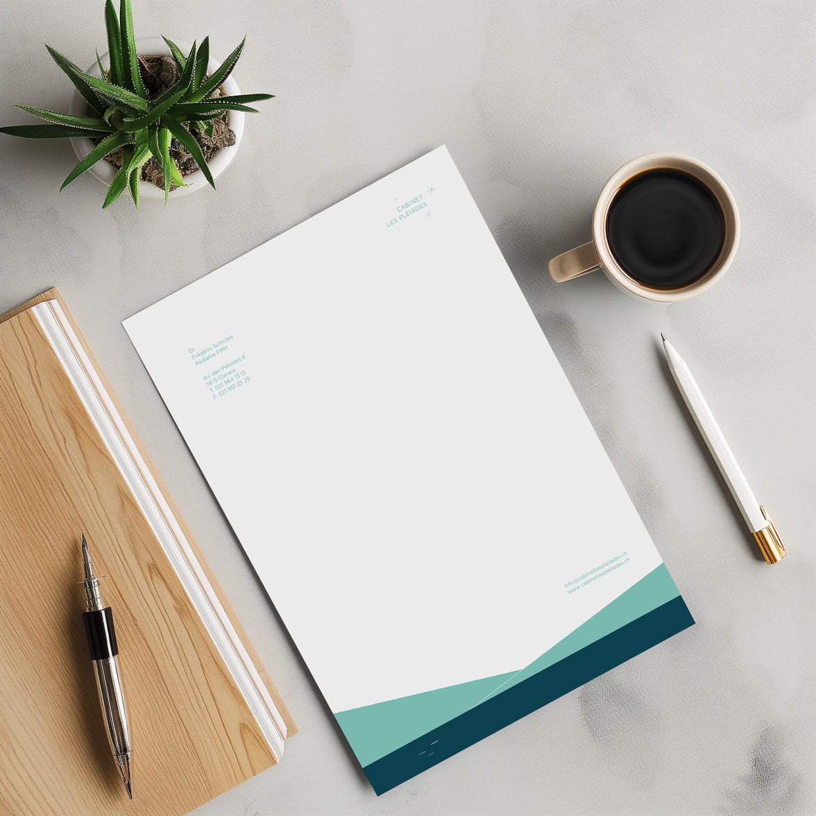 Les visuels présentés illustrent la reproduction fidèle de l’identité visuelle d’un cabinet médical pédiatrique situé à Clarens, en Suisse.